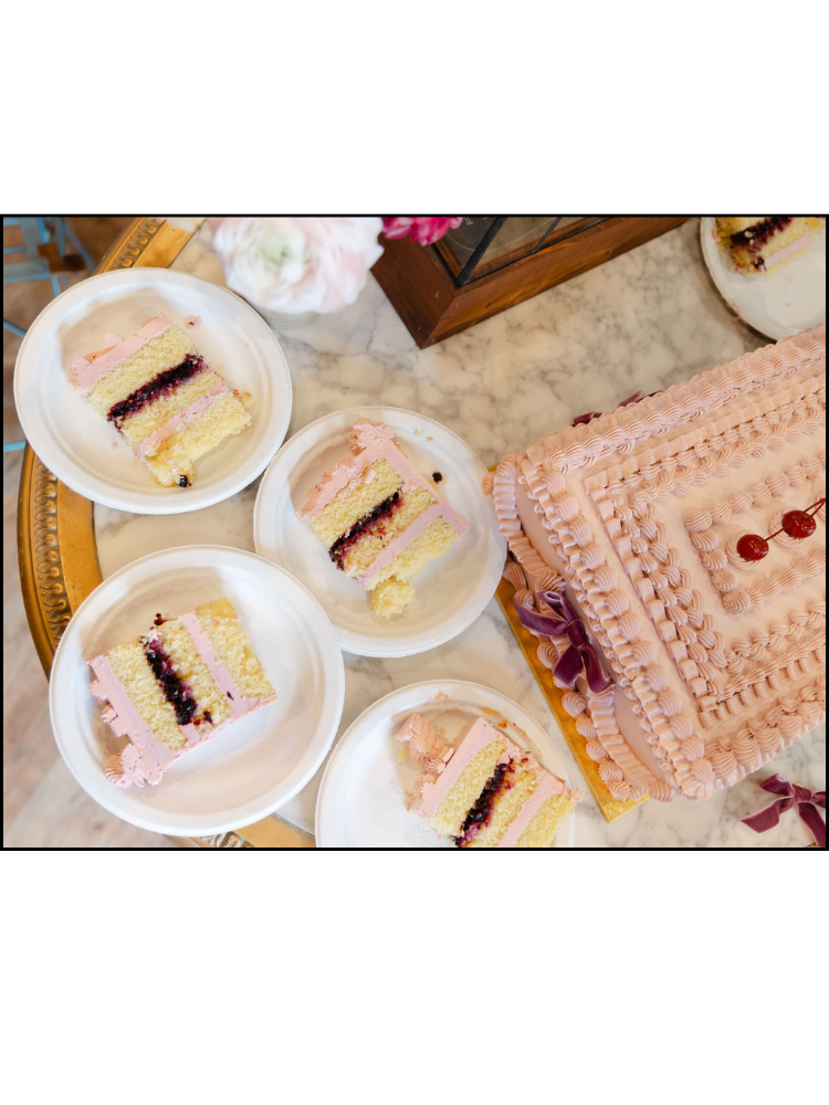 If you are doing a two-layer cake, go heavy on the fillings in the middle. If we have more than one filling we often layer both between the cake layers and then smooth the cake in vanilla buttercream in the color of our choice. If the design allows, we ice the cake in flavored buttercream.
