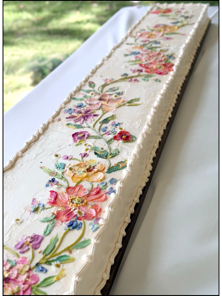 If you have a decorating style that feels like your own, I’d encourage you to try it on this long cake format. I can see everything from buttercream flowers to piped embroidery looking stunning on a table runner cake.